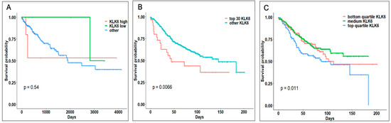 2.2. Survival Analysis of Samples with Overexpressed KLK6
