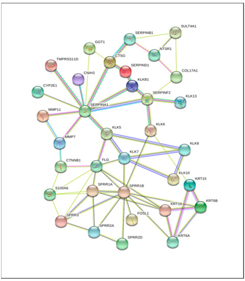 - Szklarczyk, D.; Gable, A.L.; Lyon, D.; Junge, A.; Wyder, S.; Huerta-Cepas, J.; Simonovic, M.; Doncheva, N.T.; Morris, J.H.; Bork, P.; et al. STRING v11: Protein-protein association networks with increased coverage, supporting functional discovery in genome-wide experimental datasets. Nucleic Acids Res. 2019, 47, D607–D613. [Google Scholar] [CrossRef] [PubMed]