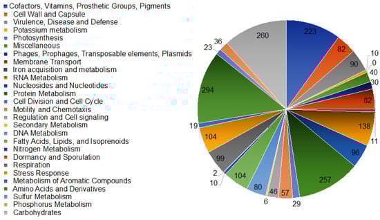 A GTDB-Tk analysis placed the bacterium W12 in the genus Asaia []. Asaia sp. W12 formed a clade with mosquito-associated A. bogorensis SF2.1 and A. bogorensis GD01, as well as ant-associated Asaia As-1742 (Figure 1); however, it departed from the cluster formed by plant-associated A. prunellae JCM25354, A. platycodi JCM25414, and A. astilbis JCM15831 (Figure 1). Overall, the Asaia species showed a different evolution pathway from the outgroup representative Acetobacter tropicalis strain BDGP1 (Figure 1). The genome sizes of the insect-associated A. bogorensis (i.e., A. bogorensis SF2.1 and A. bogorensis GD 01) were more similar to those isolated from the plants (Table 1). Asaia sp. W12 had the largest genome size (3.94 M) among the selected Asaia (Table 1). However, the average genome sizes (Table 1) in the insect-associated Asaia species (average 3.59 M, n = 4) were significantly larger (t-test, p < 0.05) than those from plant-associated ones (average 3.17 M, n = 5). The assembled genome of Asaia sp. W12 contained 229 contigs and 3652 coding sequences (CDSs) (Table 1). The average GC content in W12 was 60.1%, consistent with those in most of the selected Asaia species. It is interesting that the average GC content in Asaia prunellae JCM 25354 was much lower (55.8%) than that in the other Asaia (Table 1). A genome analysis of Asaia sp. W12 by the RAST Server revealed at least 378 subsystems classified into 27 categories (Figure 2). Among these categories, the “amino acid and derivatives” subsystem had the largest number (294 CDSs), followed by carbohydrate metabolism (260), protein metabolism (257), and RNA metabolism (138). Moreover, the “stress response” category accounted for at least 104 CDSs. Within the “virulence, disease, and defense” subsystem (90 CDSs), 12 of them were related to invasion and intracellular resistance, while 72 were associated with a resistance to antibiotics and toxic compounds (Figure 2).
