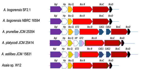 The operon organization of bacterial cellulose biosynthesis in selected Asaia strains. Bgl (purple); β-glucosidase gene; Hp (white), hypothetical protein gene; BcsQ (yellow), bacterial cellulose synthase (BCS) Q gene, involved in cellular localization of the BCS complexes; BcsB (red), bacterial cellulose synthase subunit B gene; BcsC (dark red), bacterial cellulose synthase subunit C gene; BcsD (black), bacterial cellulose synthase subunit D gene; GT2 (blue), glycosyltransferase family 2 gene; CdG, C-di-GMP precursor gene (dark blue).