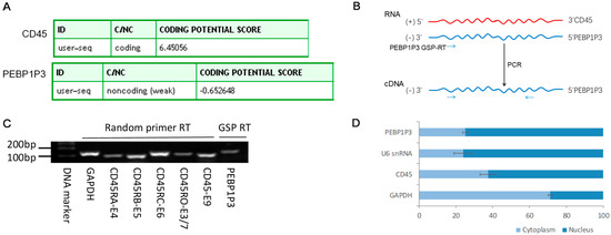 The coding potential and subcellular distribution of CD45 and PEBP1P3 RNA. (A) The coding potential predicted with the online web server CPC. (B) Identification of the CD45 antisense RNA PEBP1P3 in HuT 78 cells through gene-specific primer (GSP) RT-PCR and sequencing. (C) RT-PCR and agarose gel electrophoresis of CD45 isoforms and PEBP1P3. (D) The subcellular distribution ratio of RNA determined by RT-qPCR after the separation of the nuclear and cytoplasmic fractions in HuT 78 cells.