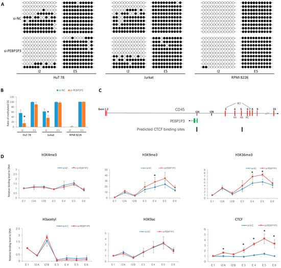 The effect of PEBP1P3 knockdown on DNA and histone modification of CD45. (A,B) The DNA methylation status and methylation ratio of CpG sites on CD45 intron 2 (I2) and exon 5 (E5) after PEBP1P3 was knocked down in HuT 78, Jurkat and RPMI 8226 cells. Closed circles represent methylated CpG sites, and open circles represent unmethylated CpG sites. (C) The sketch indicates the locational relationship of the CD45 and PEBP1P3 genes, CD45 RNA isoforms, locations of primers applied in ChIP and two potential CTCF binding sites predicted through online CTCFBSDB 2.0. (D) The levels of trimethylated histone H3K4 (H3K4me3), trimethylated histone H3K9 (H3K9me3), trimethylated histone H3K36 (H3K36me3), acetylated histone (H3acetyl), acetylated H3K9 (H3K9ac) and CTCF binding at different locations of CD45 DNA after PEBP1P3 was knocked down in HuT 78 cells. Each experiment was repeated three times, and the quantification was presented as the mean ± SEM. si-NC: interference of negative control; si-PEBP1P3, interference of PEBP1P3; * p < 0.05.