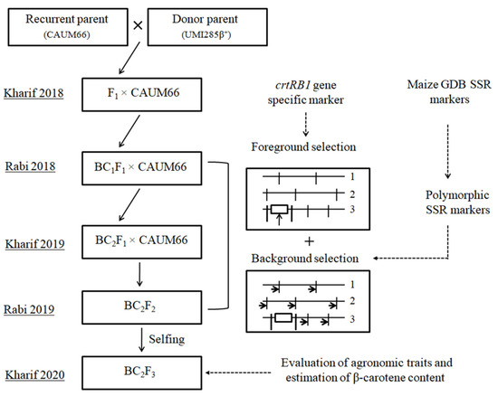 Scheme of marker-assisted backcross breeding (MABC) to improve the β-carotene content in CAUM66.