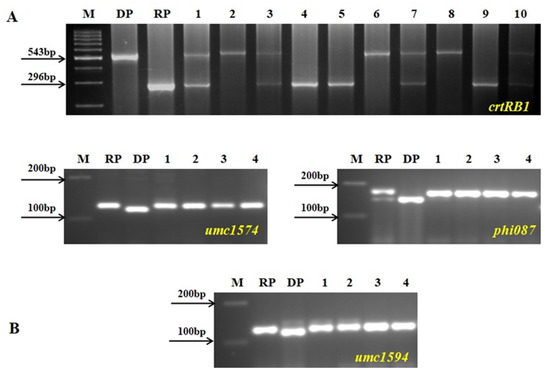 Genotyping in the backcross and selfed population of CAUM66 × UMI285β+. M, Ladder (100 bp); DP, donor parent; RP, recurrent parent. (A) Foreground screening; 1–10, segregating progenies. (B) Background screening: 1, CAUM66-54-9-12-2; 2, CAUM66-54-9-12-11; 3, CAUM66-54-9-12-13; 4, CAUM66-54-9-12-24.