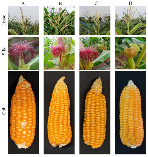 A total of 14 major agronomic traits were investigated in the selected lines to learn the morphological resemblance of the recurrent parent, CAUM66. Traits were days to tasseling (days), days to silking (days), plant height (cm), ear placement height (cm), tassel length (cm), number of tassel branches (No.), leaf length (cm), leaf breadth (cm), cob length (cm), cob weight (g), number of kernel rows per cob, number of kernels per row, 100 kernel weight (g), and single plant yield (g). These were recorded according to the IBPGR (International Board of Plant Genetic Resource) descriptors.