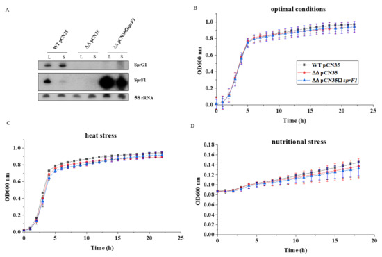 The SprG1/SprF1 type 1 TA system does not influence S. aureus N315 growth in laboratory conditions. (A) Northern blot analysis of the expression of SprG1/SprF1 system components in S. aureus N315 (WT pCN35), the sprG1/sprF1 deletion mutant (ΔΔpCN35), and SprF1 antitoxin (over)expressing (ΔΔpCN35ΩsprF1) strains grown to logarithmic (L) and stationary (S) phases. (B–D) Growth curves in optimal and stress conditions.