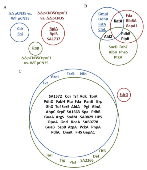 Impacts of the SprG1/SprF1 type I TA system on the S. aureus N315 proteome. Differentiating proteins in the intracellular proteome at logarithmic (A) and stationary (B) growth phases and in the extracellular proteome at stationary growth phase (C), comparing: wild-type (WT pCN35) and the SprG1/SprF1-deleted module (ΔΔ pCN35) (blue circle); WT pCN35 and SprF1 (over)expressing strain (ΔΔ pCN35ΩsprF1) (green circle); ΔΔ pCN35 and ΔΔ pCN35sprF1 (red circle). Proteins upregulated in comparison to the second component from the pair are underlined. For the meaning of the protein acronyms, please refer to Table 2 and Table 3.