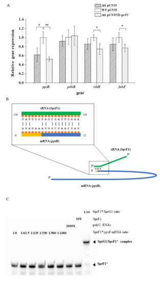 (Over)expression of SprF1 antitoxin decreases the level of gene transcripts expressing proteins identified as downregulated in the intracellular proteome. (A) RT-qPCR analysis of mRNAs isolated from S. aureus N315 (WT pCN35), sprG1/sprF1 deletion mutant (ΔΔ pCN35), and the sprG1/sprF1 deletion mutant with the SprF1 antitoxin expressing (ΔΔ pCN35ΩsprF1) plasmid. * and **, denote statistical significance at p < 0.05 and p < 0.01 level, respectively. (B) A model of in silico predicted interactions between the gene transcript (ppiB) for peptidyl-prolyl cis-trans isomerase and the SprF1 antitoxin (sRNA). (C) EMSA of radioactively labeled SprF1 (SprF1 *) with mRNA for ppiB. SprG1/SprF1 * complex serves as a positive control.