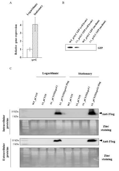 Comparison of extracellular proteomes between the mutant strain without sprG1/sprF1 TA system (N315ΔsprG1/ΔsprF1) and the wild-type strain (N315), and between the sprG1/sprF1 deletion mutant with the enhanced expression of SprF1 antitoxin (N315ΔsprG1/ΔsprF1 + pCN35ΩsprF1) and N315 resulted in the identification of 44 and 46 differentially expressed proteins, respectively (Table 3, Figure 2C, Supplementary Figure S2, and Supplementary Table S1). Strikingly, the expression of all those proteins was reduced in the sprG1/sprF1 deletion mutants, compared to the isogenic N315 strain. Moreover, 37 proteins were common to both sets when compared. Interestingly, with the exception of four truly extracellular proteins (clumping factor B (ClfB), IgG-binding protein A (SpA), glutamyl endopeptidase (SspA) and cysteine protease, staphopain B (SspB)), and cell membrane-bounded ATP synthase subunit α (AtpA), all the other differentiating proteins were cytoplasmic. The presence of cytoplasmic proteins (CPs) in the exoproteomes has already been observed, but the mechanisms of their release are elusive [26]. We hypothesized that the presence of CPs outside the bacteria could reflect the activation of the SprG1/SprF1 type I TA system, resulting in the expression of the SprG1 toxin which, in turn, disrupts bacterial cell membranes and allows CPs to be expelled. One of the roles attributed to TA systems is to respond to environmental stress [6]. Transitions from logarithmic to stationary growth phases are a canonical example of a reaction to stress-induced by increasing cell density and exhaustion of nutrients. To test whether the SprG1/SprF1 TA system is involved in the response to such stress, we compared mRNA levels of the SprG1 toxin at logarithmic and stationary growth phases. RT-qPCR confirmed that the SprG1 mRNA level is over 3.5 higher in cells after a 15-h cultivation in comparison to those after 3.5 h post-inoculation (Figure 4A). The result is consistent with previous semi-quantitative Northern blot analysis (Figure 1A). Using the S. aureus strain overexpressing the flagged version of SprG1 (Supplementary Figure S3) [12] and performing Western blot using anti-Flag antibodies, we detected the presence of the sprG1-encoded peptide inside and outside the cell at the logarithmic and stationary growth phases (Figure 4C), suggesting that the SprG1 peptides permeabilize the S. aureus membrane to release CPs into the medium. To verify if the sprG1-encoded peptides can promote cell protein leakage by pore formation, as is the case for the TisB or HokB type I toxins [27,28,29], we transformed S. aureus N315 and the N315ΔsprG1/ΔsprF1 mutant with a plasmid, pALCP2G, constitutively expressing GFP [23] and performed Western blots of post-culture medium with anti-GFP antibodies. Despite GFP overexpression in bacterial cells, we did not detect the presence of GFP in the medium of either strain (Figure 4B). This indicates that the release of CPs into the medium is not due to SprG1-driven massive cell leakage triggered by pore formation. Altogether, these results support the hypothesis that the SprG1-driven CP release could be related to a membrane disruption via a detergent-like effect or to an interference with membrane-associated functions, however, the elucidation of a specific mechanism requires further studies.