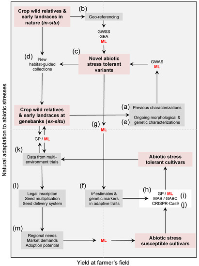 A roadmap of trans-disciplinary approaches aiming at harnessing genebank utilization for climate change research in the face of heat, and water scarcity. Compiling (a) previous characterizations and (b) geo-referencing-derived climate data/indices of available genetic resources in genebanks is a starting point to (c) assess the extent of abiotic stress tolerance among existing accessions, and the need of (d) new habitat-based population-guided collections targeting isolated pockets of cryptic diversity in dry and semi-arid regions. Planning question-oriented collecting trips of crop wild relatives and hidden landraces across contrasting environments/agro-ecologies is needed now more than ever, despite a century of gathering and preserving diversity in plants throughout genebanks. Coupling ex situ agro-ecological screenings together with (e) ongoing in situ genebanks characterizations for morphological and genetic variation is essential to define (c) putative tolerant reference collections, while understanding the (f) heritability (h2) of adaptive traits and their genetic architecture (i.e., underlying genes) via genome-wide selection scans (GWSS), genome–environment associations (GEA), and genome-wide association studies (GWAS). Since identifying these novel sources of heat and drought tolerance demands merging heterogeneous datasets, (g) machine learning (ML, in red letters) promises speeding up genebank characterization. The distinction that clustering (Table 1) and ML (Figure 2 and Table 2) strategies can provide between abiotic stress tolerant and susceptible accessions is essential to (h) transfer useful genetic variation from wild crop donors and early landraces into elite cultivated lines, either by designing (i) genomic-assisted breeding programs such as genomic prediction (GP) and inter-specific marker- and genomic-assisted backcrossing (MAB and GABC) schemes, or by envisioning (j) multi-trait gene editing strategies (e.g., CRISPR-Cas9). Once (k) abiotic stress tolerant varieties are validated across different environments, (l) legal inscription, seed multiplication, seed delivery system to farmers’ associations, and (m) follow-up given the regional needs, market demands, and adoption potential, are necessary downstream validation steps. These heterogeneous datasets are also likely to be inputted into ML, and in turn feedback new needs beyond heat and drought tolerance such as other types of resistances and nutritional quality. For ML to succeed speeding up the breeding of heat and drought-tolerant crops, there must be long-term funding to generate and maintain an assortment of datasets at each step, which in turn need to be publicly available through open access repositories from various geographic locations. Red boxes highlight different reservoirs of wild and cultivated diversity within the Cartesian space, gray boxes are mixed datasets built around these collections, and connectors are methodological approaches.