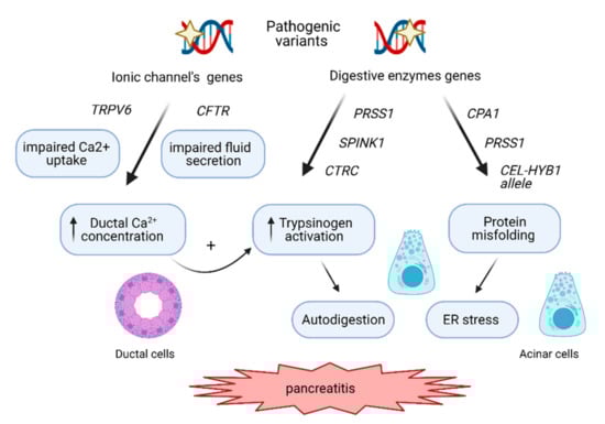 The third pathomechanism related to pancreatitis genetic risk is a ductal pathway which is caused by genetic variants in the genes encoding proteins involved in ductal secretion. So far, variants in two genes encoding transmembrane ionic channels: CFTR (cystic fibrosis transmembrane conductance regulator) and the TRPV6 (the transient receptor potential cation channel, subfamily V, member 6), seem to be involved. It is speculated that the variants of these genes cause the alteration of the ductal fluid Ca2+ concentration and, hence, increase ductal Ca2+ levels that eventually would stimulate autoactivation of trypsinogen [24,25].