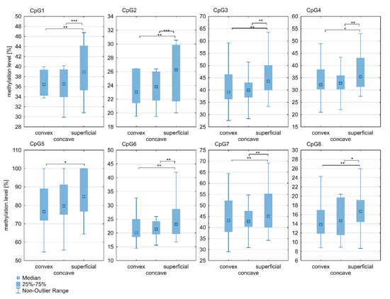 - Meng, Y.; Lin, T.; Liang, S.; Gao, R.; Jiang, H.; Shao, W.; Yang, F.; Zhou, X. Value of DNA methylation in predicting curve progression in patients with adolescent idiopathic scoliosis. EBioMedicine 2018, 36, 489–496. [Google Scholar] [CrossRef]