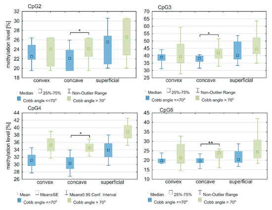 2.4. Association between Methylation Status of ESR1 and Cobb Angle