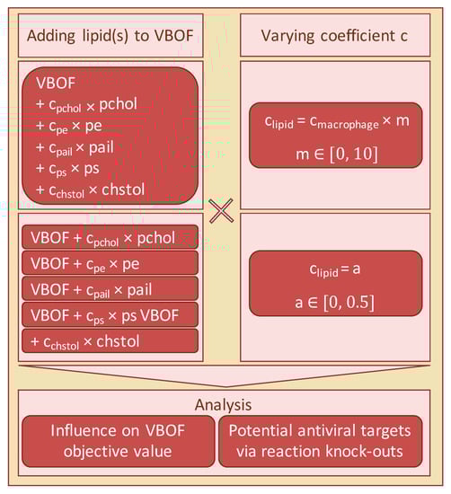 Workflow for the investigation of lipids’ influence on the VBOF. The five lipids phosphatidylcholine (pchol), phosphatidylethanolamine (pe), phosphatidylinositol (pail), phosphatidylserine (ps), and cholesterol (chstol) were added together and individually to the VBOF. The stoichiometric coefficients were either an absolute value identical for all lipids, or the initial stoichiometric coefficient from the macrophage biomass function factorized with a multiplication-coefficient. For all scenarios, the influence of the different VBOFs on the objective value was analyzed. Additionally, potential antiviral targets were examined using reaction knock-outs.