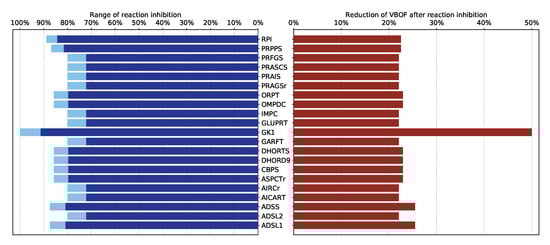 Results of the host-derived enforcement experiments. With the help of the host-derived enforcement, the range and effect of reaction inhibitions on the VBOF can be investigated while keeping the host’s maintenance at 100%. The minimum possible reaction inhibition rate to reduce the viral replication capacity (VBOF) is given in dark blue. The maximum inhibition of the reaction does not harm the host’s maintenance and is indicated in light blue. The reduction of the VBOF is given in comparison to the un-inhibited state. All reaction identifiers are BiGG identifiers [28]. Table A1 lists all reaction identifiers with their corresponding reaction name and the subsystem they occur in.