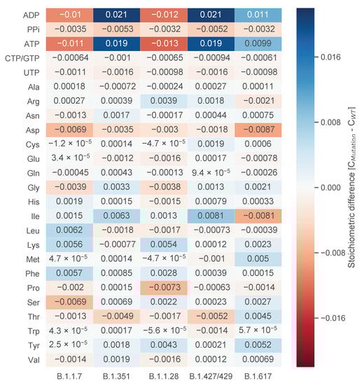 Difference of stoichiometric coefficients between wildtype (WT) and the individual mutations. The deviation between WT and the mean of the individual mutation variants was calculated. Higher stoichiometric coefficients in the mutation compared to the WT are indicated in blue, while lower stoichiometric coefficients are indicated in red. Based on similar sequence length for the mutation variants B.1.1.7 and B.1.1.28 and resulting similar total viral molar masses, a pattern emerges, which is most apparent for the stoichiometric coefficients of ATP and ADP. This pattern, however, is not present for all stoichiometric coefficients. The coefficient for l-serine, for example, is only decreased in the mutation variant B.1.1.7 based on two mutations in two structural proteins. Overall, the deviations from the WT are very small.