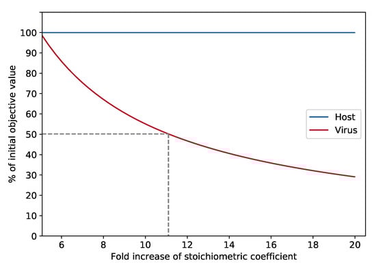 Influence of stoichiometric coefficient on reduction of VBOF during METS knock-out. With increasing factorization of phosphatidylcholine’s stoichiometric coefficient, the objective value of the VBOF’s optimization decreases during the knock-out of the methionine synthase (METS) reaction. The hosts growth maintenance stays at 100%. At an eleven-fold increase of the initial stoichiometric coefficient extracted from the host’s maintenance function results in a 50% decrease of the viral growth rate.