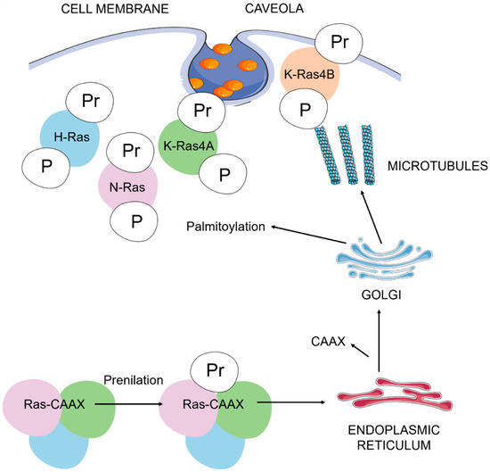 Ras post-translational modifications and trafficking to the plasma membrane. The addition of the carboxyl-terminal prenyl group is mediated by farnesyl or geranylgeranyl transferases. Inside the endoplasmic reticulum, several enzymes catalyze the removal of the AAX residues and the carboxyl methylation of prenylated cysteine residues. Palmitoylation of cysteine residues in H-Ras, N-Ras and K-Ras4A are necessary to complete, via the Golgi complex, their binding to cholesterol-rich plasma membrane pits (lipid rafts, caveola). An unknown pathway completes the binding of K-Ras4B (with a polybasic domain constituted by a lysine-rich sequence) to the plasma membrane. A: aliphatic amino acid; C: cysteine; P: palmitoyl group; Pr: prenyl group; X: serine or methionine. We represent H-Ras in blue, N-Ras in purple, K-Ras4A in green and K-Ras 4B in red.