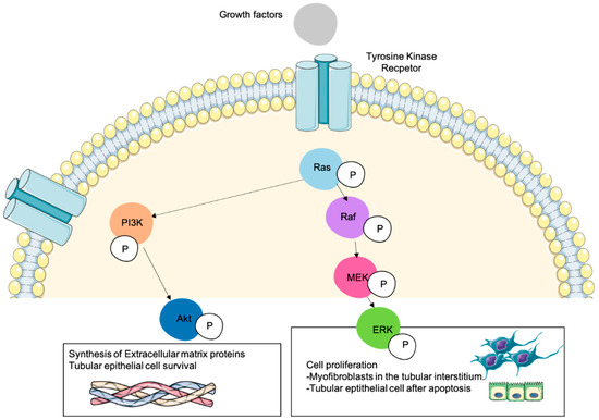 Years later, in the murine model of unilateral ureteral obstruction (UUO), an experimental model of tubule-interstitial fibrosis, Rodriguez-Pena et al. showed an increase in Ras activation during the early response after UUO. Two main pathways activated by Ras, ERK1/2 and Akt, were also upregulated after UUO. By administering U0126, a MEK1/2-ERK1/2 inhibitor and LY294002, an Akt inhibitor, the role of Ras and its effector pathways in the UUO-interstitial fibrosis was functionally demonstrated. Higher levels of phospho-ERK1/2 were detected in the tubular interstitium, associated with myofibroblast proliferation, and higher levels of phospho-Akt were detected in the dilated tubules, associated with cell survival, as a compensatory anti-apoptotic mechanism [38].