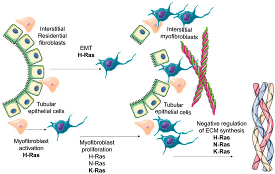 In this section, we will dissect the role of Ras proteins in the processes involved in the development of kidney fibrosis: myofibroblast abundance, especially myofibroblast proliferation—which perhaps is the most relevant mechanism by which ECM producing cells emerge during kidney fibrosis- and epithelial-to-mesenchymal transition (EMT). We will also review the different roles of Ras isoforms in ECM synthesis, a process that directly drives tissue fibrosis.