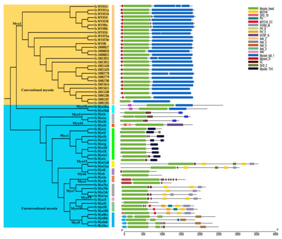 The putative functional domains were identified using SMART and Pfam databases. As shown in Figure 2, all S. schlegelii myosin genes had a motor domain (myosin head), which located in the N-terminus. In addition to myosin head, all Myo2 genes had a Myosin-N domain, except Ss_10001285. Furthermore, the domain types and numbers of myosin genes were similar within the same subfamily members but divergent among different subfamilies.