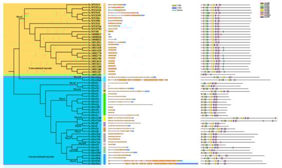 Gene structure and motif analysis of myosin genes. The maximum likelihood method was used to conduct the phylogenetic analysis of myosin genes (left panel). The exons and UTRs were indicated by orange and blue boxes (the middle panel) respectively. Different putative motifs were indicated by boxes with different colors (right panel).