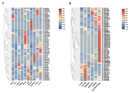 Expression profiles of myosin genes in adult tissues (A) and early developmental stages (B). The color scale represented the TPM (Transcripts-per-million) value. The red and blue color represented the relatively higher and lower TPM (Transcripts-per-million) value, respectively.