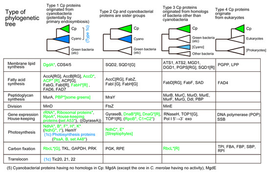 Four major types of phylogenetic relationships between cyanobacterial and chloroplast proteins. Chloroplast-encoded proteins (or RNA) are marked with an asterisk and colored. [R] and [G] indicate red and green lineages, respectively. This is an extended, revised version of the original in [,].
