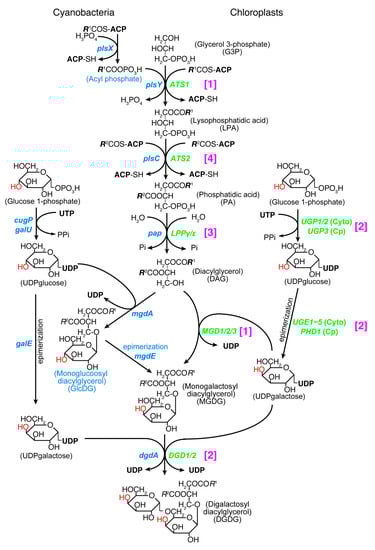 In addition, phylogenetic analysis of all the enzymes involved in the synthesis of galactolipids revealed that none of the chloroplast enzymes originated from cyanobacteria [,]. In terms of biochemical reaction, the second acylation and the dephosphorylation are common in chloroplasts and cyanobacteria. Nevertheless, phylogenetic analysis showed that the chloroplast enzymes and cyanobacterial enzymes belong to distant clades. Figure 2 shows that all enzymes in the galactolipid synthesis pathway are biochemically or phylogenetically different in cyanobacteria and chloroplasts (see Figure 1 for the summary of phylogenetic analysis). They are classified into three biochemical categories and a phylogenetic category (this is shown in magenta brackets in Figure 2). (1) Different reactions in cyanobacteria and chloroplasts: PlsX + PlsY vs. ATS1, MgdA + MgdE vs. MGD1/2/3. (2) Structurally different (non-homologous, isofunctional) enzymes: CugP/GalU vs. UGP1/2/3, GalE vs. UGE1-5/PHD1, DgdA vs. DGD1/2. (3) Chloroplast enzymes are paralogs of ER enzymes: Pap vs. LPPγ/ε. Therefore, the galactolipid biosynthesis system is unrelated to cyanobacteria and chloroplasts, and this is mostly supported by evidence that does not rely on phylogenetic analysis. (4) Only the contrast PlsC vs. ATS2 was based on phylogenetic analysis that robustly supported their distant relationship.