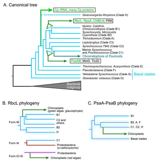 Schematic phylogenetic trees showing different origins of chloroplast enzymes (or RNA) within the cyanobacterial diversity. (A) Canonical phylogenetic tree of cyanobacteria and chloroplasts. Various clades of cyanobacteria are shown according to [,]. Chloroplast-encoded proteins and RNA are shown in green. Nuclear-encoded chloroplast proteins are shown in black. The clade names are taken from []. According to [], G. lithophora is sister to the main chloroplast clade represented by chloroplast rRNA. For simplicity, Clade H is used for G. lithophora. The positions of branching of RbcL and PsaA/B are shown with dotted lines because they do not match exactly with the canonical tree. (B) Different origins of chloroplast and cyanobacterial RbcL. (C) Probable origin of PsaA and PsaB. As explained in the text and Supplementary Materials, the phylogeny of PsaA and PsaB is very difficult. This diagram, which is consistent with previous results, is still a plausible hypothesis among many other alternatives. Different line colors are used to show different lineages such as cyan for cyanobacteria and green for chloroplast. Colored protein names are used to show chloroplast-encoded proteins.
