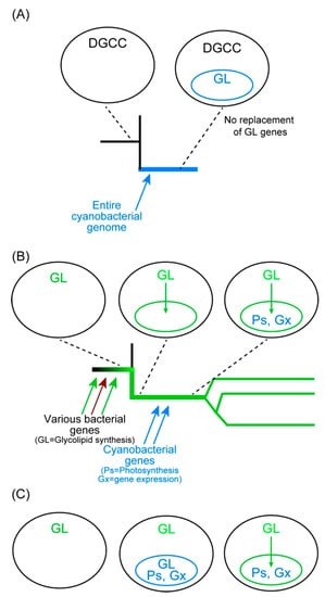 Cyanobacteria are a distinct group of bacteria that perform oxygenic photosynthesis. They have specialized internal membranes called thylakoid membranes in which photosynthetic systems reside. Galactolipids and sulfolipids that are major constituents of the thylakoid membranes have been believed to be necessary for the photosynthetic activity. Cyanobacteria and chloroplasts of plants and algae share thylakoid membranes with galactolipids and sulfolipids, various components of photosystems, and photosynthetic pigments. These traits of substance, structure, and function as a whole were taken as good evidence for the cyanobacterial origin of chloroplasts. The endosymbiotic hypothesis of chloroplast origin was first proposed by C. Mereschkowsky in 1905 [] who obtained a hint from a short note of A. Schimper in 1883 []. Since then, it remained a well-known but unsupported hypothesis. Various authors in the 1960s revitalized the hypothesis based on the discovery of chloroplast DNA, and the similarities of chloroplasts and cyanobacteria became evident thanks to the developments in cell biology and biochemistry of photosynthetic organisms in the 1960s and 1970s. It was the phylogenetic analysis in the 1980s and later that provided convincing evidence for the cyanobacterial origin of chloroplasts. Historical views on the endosymbiotic origin of chloroplasts are explained in some review articles [,,,,,,,].