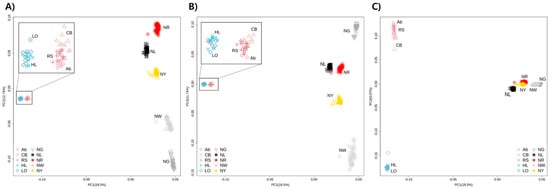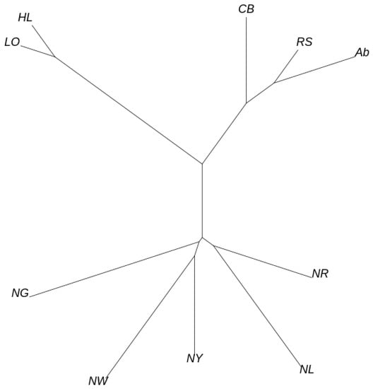 - Kamvar, Z.N.; Tabima, J.F.; Grünwald, N.J. Poppr: An R package for genetic analysis of populations with clonal, partially clonal, and/or sexual reproduction. PeerJ 2014, 2, e281. [Google Scholar] [CrossRef]
