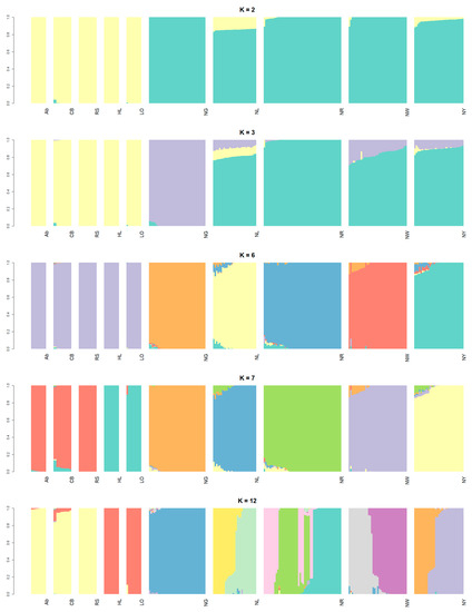 - Alexander, D.H.; Lange, K. Enhancements to the ADMIXTURE algorithm for individual ancestry estimation. BMC Bioinform. 2011, 12, 246. [Google Scholar] [CrossRef] [PubMed]