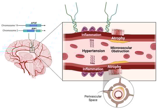The Apolipoprotein E (Apo-E) is a major cholesterol carrier that supports lipid transport. It also has an important role in Aβ metabolism, one of the pathological hallmarks of AD. It is well established that, even in asymptomatic AD stages, the APOE-ε4 allele triggers Aβ accumulation not only in the brain parenchyma but also in the perivascular region, the latter leading to cerebral amyloid angiopathy (CAA), in which blood vessel function is disrupted []. In addition, amyloid-independent effects of APOE have been described on tau neurofibrillary degeneration, microglia and astrocyte responses, and blood-brain barrier disruption []. In particular, it has been recently shown that APOE-ε4 can also increase blood-brain barrier permeability in the hippocampus and medial temporal lobe, contributing to cognitive decline independently of AD pathology []. However, controversial results have been found about its influence in ePVS [,].