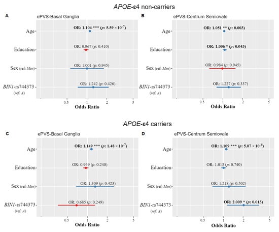 For APOE genotype, we adjusted three models. In the first model, we compared ε4 carriers vs. non-carriers (APOE status). In the second model, we compared individuals depending on the number of ε4 alleles. Finally, in the third model, we compared ε3ε3 individuals (reference category) vs. ε2ε3, ε3ε4, and ε4ε4. APOE-ε2ε4 individuals were excluded in all analyses. Moreover, we additionally stratified the analysis of BIN1 rs744373 polymorphism by APOE-ε4 status, and we explored interaction effects between BIN1 rs744373 and APOE-ε4 status. To assess the association between demographic variables and ePVS, we additionally computed ORs using logistic regression models.