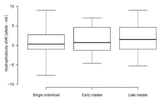 Out of 76 amino acid substitutions, 44 (58%) changes occurred, making amino acids more hydrophobic. A considerably lower number of substitutions, 29 (38%), resulted in opposite shifts, i.e., to less hydrophobic amino acids. Three (4%) amino acid substitutions did not influence the hydrophobicity of the site. Some changes were quite dramatic. For example, 14 substitutions increased the amino acid hydrophobicity by a factor of five (based on the Kyte and Doolittle’s scale [33]). By contrast, only three substitutions decreased the hydrophobicity by a similar magnitude. In order to validate the results, we also calculated shifts using the hydrophobicity scale of Palecz [34], which is based on averaged values obtained by different biochemical approaches (Figure S1). It provided similar results to the scale of Kyte and Doolittle [33]. Late clades showed slightly increased cumulative hydrophobicity levels on average (1.45) compared to early (1.20) clades and single (0.61) individual viruses (Figure 4) while the difference was not significant (p > 0.05, Mann–Whitney U test, Table S7). We also analyzed the relationship between the nucleotide substitution type and hydrophobicity resulting from the amino acid change (Figure S2). The C>U transitions and G>U transversions lead to more hydrophobic amino acids in most cases. By contrast, the C>A and U>C substitutions were associated with decreased hydrophobicity values.
