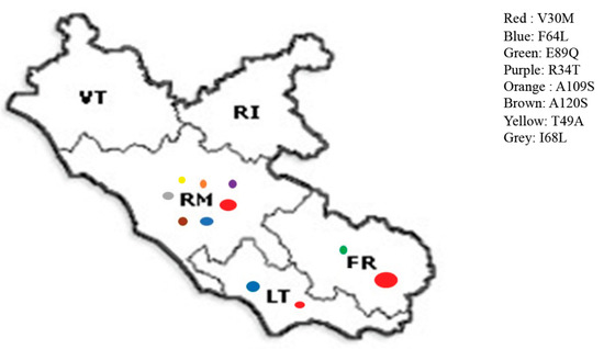 Distribution of TTR mutations in Lazio region among different provinces. Diameter of circles is proportional to number of patients.