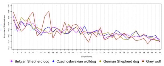 When considering any dog breed’s genetic makeup, repeated mating of close relatives to fix specific traits of breeds can be found. From a genomic perspective, such a mating resulted in offsprings with long ROH segments spread across the genome. Most of them have shared history through close relatives, which led to the segregation of often rare recessive or partially recessive genetic variants producing in the homozygous state a deleterious phenotype [6]. Thus, the identification of long ROH segments is of eminent interest in livestock and companion species [7,8] to analyse the effect of selective breeding on genome composition and prevent deleterious variants from acting, especially in small genetically limited populations. As a result of selective breeding, small populations lose their genetic diversity and become endangered by extinction much faster than large populations [9]. The long ROH segments were also found in the wild species’ genome, including wolves [10,11].