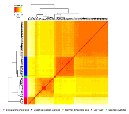 The preference of specific phenotypes from the long-time perspective and relative uniformity of the GSD breed resulted in a high degree of genetic fixation inside this group, i.e., analysed animals showed a similar allelic frequency across all SNP markers. A high proportion of intrapopulation genetic similarity was also observed in the CWD group, indicating preferential mating concerning certain common ancestors. However, due to the current status of the breed, such preferential mating is undesirable. The GW group, whose genome was shaped by natural selection related to survival traits for a long time [16], showed a lower intrapopulation similarity than those of CWD and GSD. Such a selection pressure was not affected by the domestication process and acted in the GW genome substantially longer compared to dog breeds [50]. Due to the low number of SWD, it was not possible to evaluate its intrapopulation diversity. The SWD group was only used to describe better interpopulation relationships within groups of breeds derived from GW. As shown in Figure 2, the intrapopulation genetic fragmentation occurred mainly inside the BSD group. The observed fragmentation is caused by the fact that this study included various BSD types, which significantly differs in their phenotypes (Malinois, Tervuren, Laekenois, and Groenendael) [51].