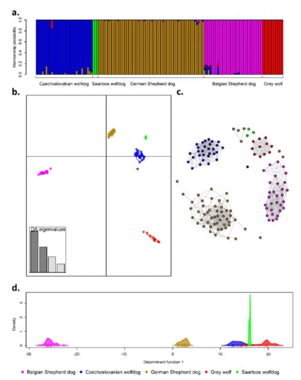 - Smetanová, M.; Černá Bolfíková, B.; Randi, E.; Caniglia, R.; Fabbri, E.; Galaverni, M.; Kutal, M.; Hulva, P. From wolves to dogs, andb: Genetic composition of the Czechoslovakian Wolfdog. PLoS ONE 2015, 10, e0143807. [Google Scholar] [CrossRef] [PubMed]
