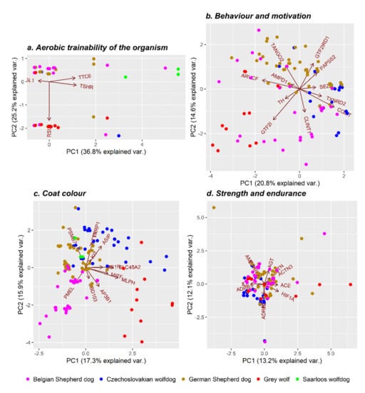 Population differentiation based on variants near genes of relevance for the selected phenotypic traits (aerobic trainability of the organism (a), behaviour and motivation (b), coat colour (c), and strength and endurance (d)).