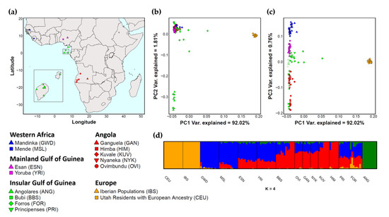 - Gelabert, P.; Ferrando-Bernal, M.; de-Dios, T.; Mattorre, B.; Campoy, E.; Gorostiza, A.; Patin, E.; González-Martín, A.; Lalueza-Fox, C. Genome-Wide Data from the Bubi of Bioko Island Clarifies the Atlantic Fringe of the Bantu Dispersal. BMC Genom. 2019, 20, 179. [Google Scholar] [CrossRef]
