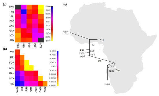 Ancestry inference in the studied populations. (a) CHROMOPAINTER coancestry matrix based on the number of haplotype segments (chromosome chunks) shared between donor (columns) and recipient (rows) populations. The copy profile of each recipient group is an average of the copy profiles of all individuals belonging to that group. (b) Matrix of pairwise TVDxy distances based on the ancestral profiles of the recipient groups in panel (a). The scales of chunk counts and TVDxy values are shown to the right of the matrices. (c) Neighbor-Joining (NJ) tree based on TVDxy distances. Values indicate the percentage of NJ partitions observed in 1000 replicas of the coancestry matrix, generated by sampling the individual copy profiles from each population with replacement. The NJ tree was rotated to fit the approximate geographic location of the recipient groups. Abbreviations: GWD (Mandinka), MSL (Mende), ESN (Esan), YRI (Yoruba), ANG (Angolares), BBS (Bubi), FOR (Forros), PRI (Principenses), GAN (Ganguela), HIM (Himba), KUV (Kuvale), NYK (Nyaneka), OVI (Ovimbundu).