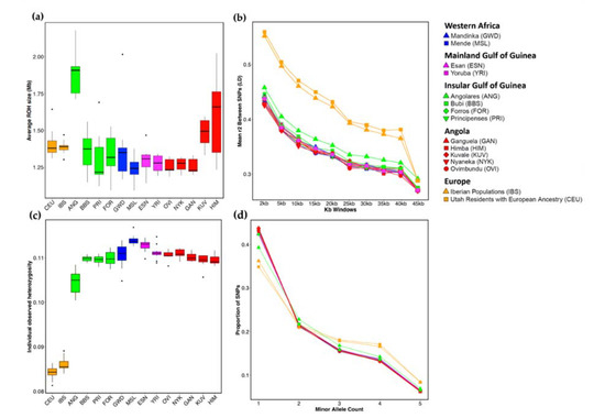 We characterized genetic diversity using observed, individual per locus heterozygosities (Ho), runs of homozygosity (ROH), LD measured by the squared correlation of allele frequencies (r2), folded Site Frequency Spectra (SFS) and individual inbreeding coefficients (Fis). To control for uneven sample sizes in LD, SFS and Fis calculations, we downsampled the number of individuals to 5 (the sample size of the Ovimbundu, Nyaneka and Ganguela). We repeated this process ten times, calculating each summary statistic in each replicate, and taking the average over replicates as the final estimate.