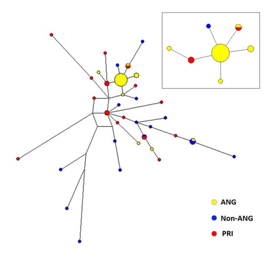 Network representing the haplotype variation in African-derived Y-chromosomes from São Tomé and Príncipe. Haplotypes were defined by using 10 microsatellite loci (DYS19, DYS389I, DYS389II, DYS390, DYS391, DYS392, DYS393, DYS437, DYS438, DYS439). Locus DYS385 was excluded from the network because it is duplicated. The inset shows the descent cluster centered around the most frequent haplotype in the Angolares. Haplotypes from the Angolares (ANG) and from a sample of linguistically uncharacterized non-Angolar residents of São Tomé (Non-ANG) were previously reported [22]. The newly generated data on the Y-chromosome haplotypes from Príncipe (PRI) are shown in Table S4. Circles represent haplotypes, area is proportional to frequency, and colors represent populations. Lines represent microsatellite mutational differences.