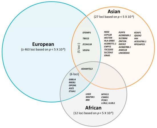 Altogether, most FD-associated loci initially discovered in studies including participants of European descent have not been widely replicated in Asian and African individuals so far. Although the majority of previous studies focused on European cohorts [19,20,23,24], recently emerging non-European studies proposed several novel FD susceptibility loci. Some of them showed consistent effects of FD loci across populations, suggesting that FD loci might be partially shared between different ethnicities (Figure 1). In summary, only 22 loci have been found independently in the Asian studies and seven loci in the African studies with a relatively weak threshold p < 5 × 10−6.