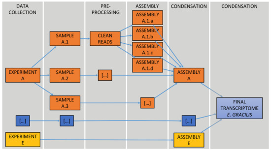 Pre-processed reads (paired, unpaired and singleton reads) were assembled per experiment in two steps to yield five transcriptomes, one per experiment. We used Trinity v2.4.0 software [59] for de novo transcriptome assembly. During the first step, samples of each experiment were assembled four times, combining values (one/two) of minimum count for k-mers to be assembled (–min_kmer_cov) with normalization turned off (–no_normalize_reads) or on (default) to provide maximal sensitivity for reconstructing lowly expressed transcripts. In all cases, we used the default parameters with a minimum contig length (–min_contig_length) of 100 nt. Second, to reconstruct one single transcriptome per experiment, the four assembled transcriptome replicates were pooled together with the tr2aacds.pl script (using default parameters) from the EvidentialGene v2016.07.11 software package [60,61].