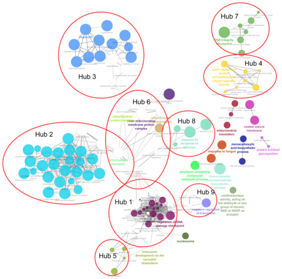 The clusters based on the 2500 most variable genes were further analysed to visualize overrepresented biological terms using the whole GO and KEGG term space from Section 2.4 as a background. We explored enriched pathways within the expression clusters using ClueGo v2.5.0 tool [95], a visualization plug-in implemented in the Cytoscape v3.6.0 environment [96]. Term overrepresentation was estimated by an enrichment test based on the hypergeometric distribution followed by Benjamini–Hochberg adjustment for multiple testing. An annotation network was built with the ClueGo plug-in from kappa scores, which reflect the associations between genes and GO and KEGG terms. Network specificity was set between 3 and 12 GO hierarchy levels, and term selection was set to a minimum of 3% genes per cluster. Kappa score threshold was set to 0.3, and we allowed GO parent-child term fusion. Moreover, we explored the network with the MCODE algorithm [97], implemented as a Cytoscape plug-in, to detect densely connected regions or hubs in the network. Those hubs were found in the network establishing a degree cut-off of 2 for network scoring criteria, without including loops. Option Fluff was selected and parameters for Cluster Finding panel were set at 0.1 and 0.2 for node density and node score cut-off, respectively, a minimum of 2 edges per node of cluster cores (K-Core) and a maximum depth of 100.