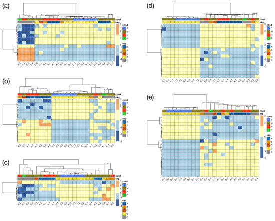 Selected co-expression clusters computed on the 2500 most variable genes. Only the five clusters characterized by significantly overrepresented ontological terms (featuring 631 transcripts) are shown. Heat maps and trees regroup samples behaving similarly across genes on the horizontal axis and genes behaving similarly across samples on the vertical axis; gene expression is vertically clustered to facilitate visualization (see text). Samples are colour-coded both by condition (F = fermentative, M = mixotrophic, H = heterotrophic, P = phototrophic) and by study (A = PRJNA310762, B = PRJEB10085, C = PRJNA298469, D = PRJNA289402, E = PRJEB38787). (a) Cluster 1; (b) cluster 4; (c) cluster 19; (d) cluster 24; (e) cluster 25.