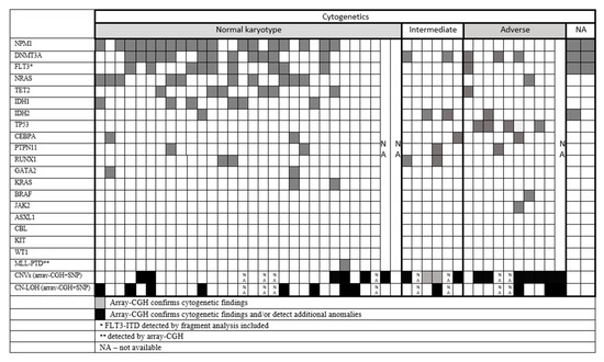 - Mehrota, M.; Luthra, R.; Ravandi, F. Identification of clinically important chromosomal aberrations in acute myeloid leukemia by array-based comparative genomic hybridization. Leuk lymphoma 2014, 55, 2538–2548. [Google Scholar] [CrossRef] [PubMed][Green Version]